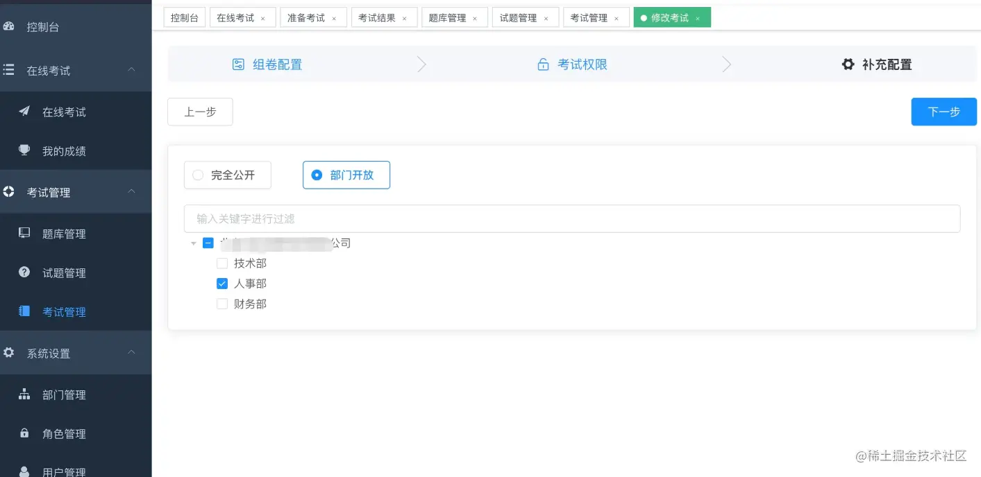 - 指定部门:只有选中部门的人员才可以看到考试。