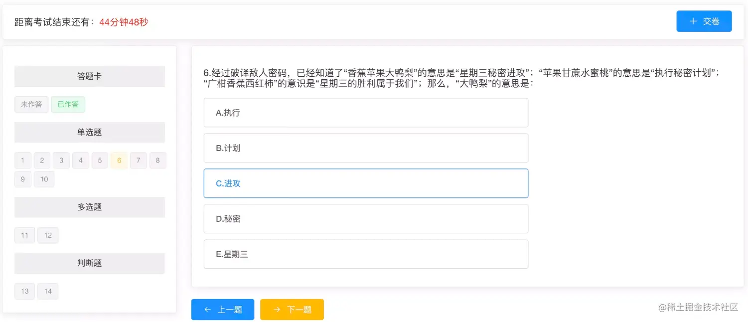 - 考试端:学生学员角色、支持在线考试、查看分数、训练错题。