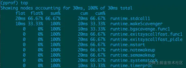 在 top 命令执行后,发现什么问题没?这个 top 命令显示的信息都是系统调用信息耗时,没有用户定义的函数。为什么?下面进行分析。