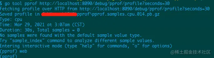 Run pprof command: go tool pprof -raw -seconds 30 http://localhost:8090/debug/pprof/profile