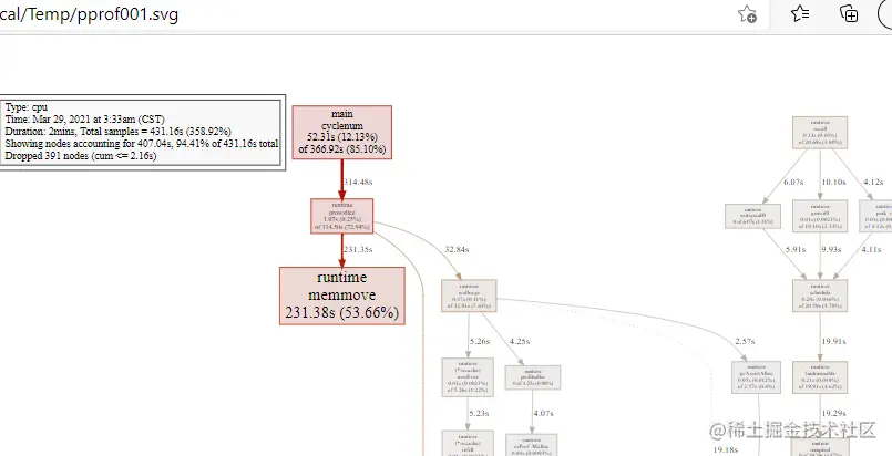 在上面第三节 runtime/pprof 中,进入终端命令行交互操作,然后输入 web 命令,就可以生成一张 svg 格式的图片,用浏览器可以直接查看该图片。我们用同样的方法来试一试。