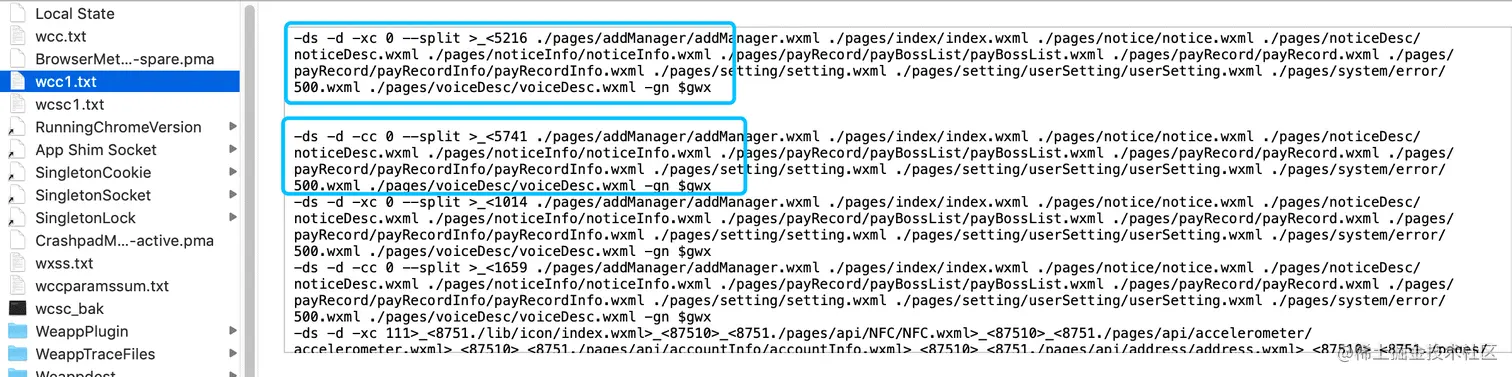 - 从上面这个图就可以看出下面这个图里面我们可以认知到一些信息首次加载的时候 wcc 执行了-ds -d - xc…和-ds -d - cc…结构的命令可以看到微信首次把所有.wxml 都执行了
