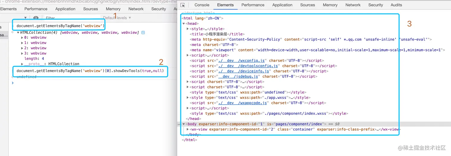 可以看到对应的有 4 个 webview,我们先要关注的是第一个 webview 因为你点开可以发现第一个对应的就是渲染层的 webview