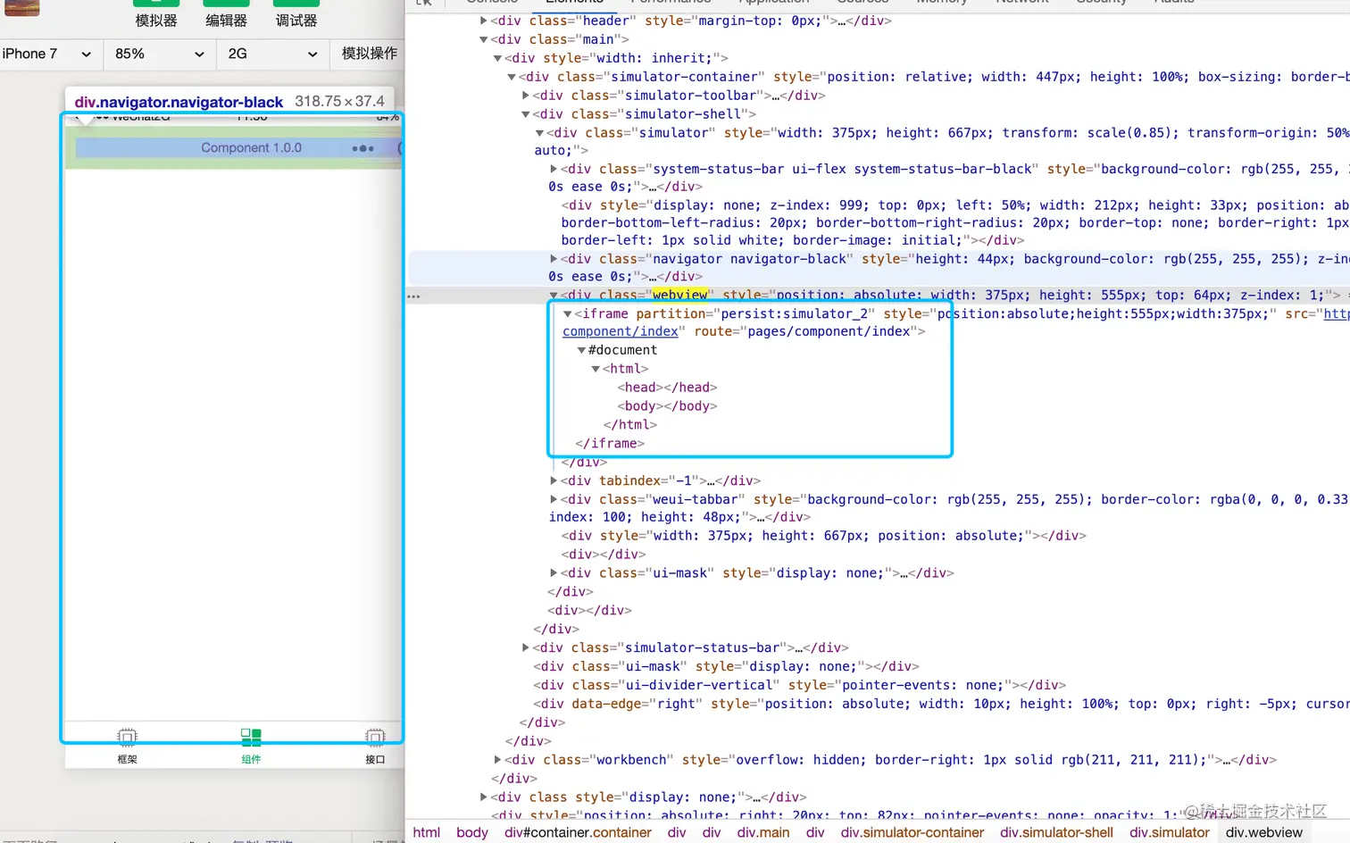 从上面的现象我们可以看出他的两层渲染层和逻辑层结构是包含在两个 webview 里面第一个对应的 webview 是渲染层的每个页面都对应一个地址但逻辑层 appservice 只有一个不变的下来我们可以看看这个 webview 里面是个什么东如果我们直接把 view 层的 webview 标签改成 iframe 的话可以看到微信就直接不在里面展示给你页面白屏了