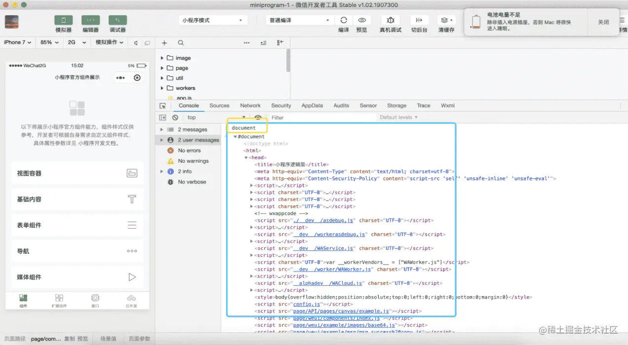 - 另一个微信开发者工具感觉做的不友好的地方是大于 500KB 的 javascript 文件不做给你做 es6 转换和压缩,就算你设置了微信也不会给你转,可以在 source 里面的资源可以看出。