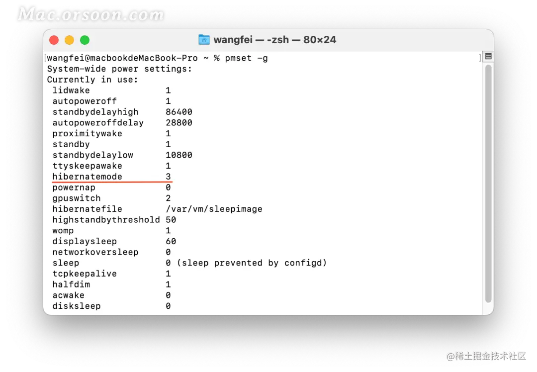 输出如上图,查看「hibernatemode」这一行。如果「hibernatemode」后面的数字是0,Mac处于此休眠模式下,表示掉电程度非常严重;如果「hibernatemode