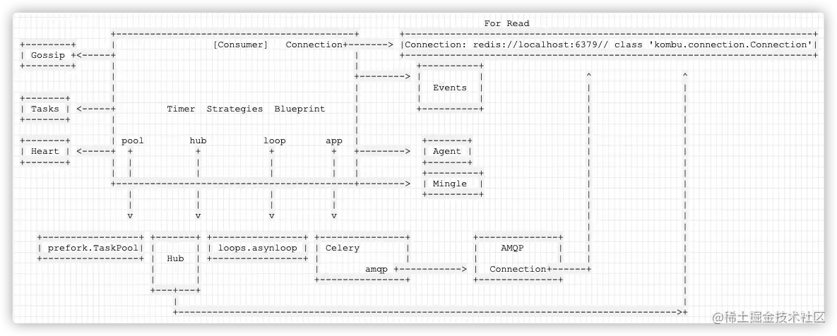 可以说,除了消息循环引擎 被 hub 承担,多进程被 Pool,Autoscaler 承担,定时任务被 timer,beat 承担之外,其他主要功能都被 Consumer 承担。
