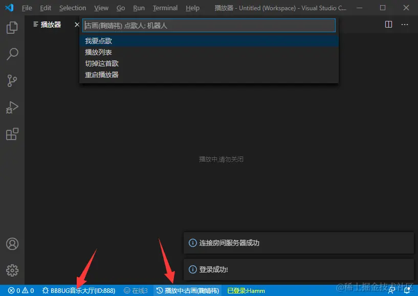 Visual Studio Code下一个集音乐/聊天等一体的在线聊天室插件,支持多房间和创建私人房间,支持房间加密和切换房间模式。