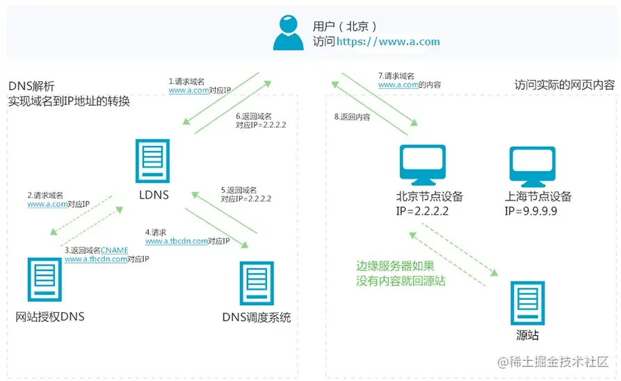 - 本地域名服务器 向 DNS 调度系统 请求获取 www.a.tbcdn.com 对应的 ip 地址,这时 调度系统 就会给到离用户最近的一个节点(北京节点设备)的 ip 地址