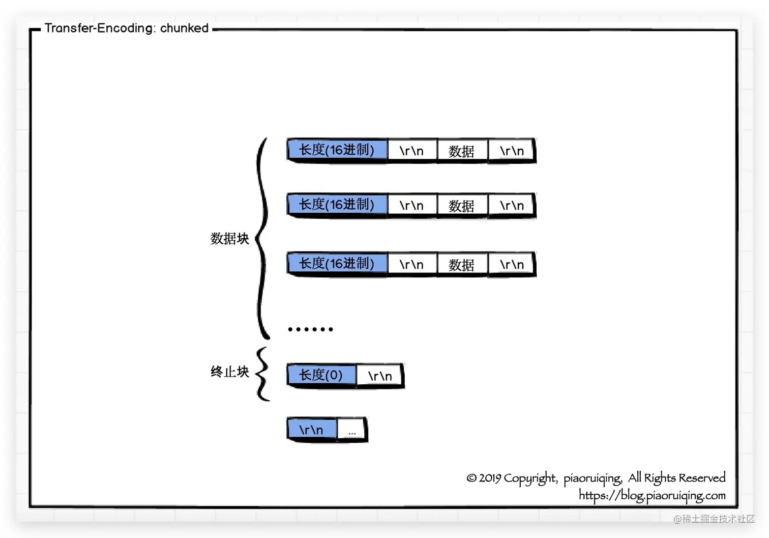 数据以一系列分块的形式进行发送,在每一个分块的开头需要添加当前分块的长度,以十六进制的形式表示,后面紧跟着 \r\n ,之后是分块本身,后面也是 \r\n,终止块是一个常规的分块,不同之处在于其长度为 0,图示如下: