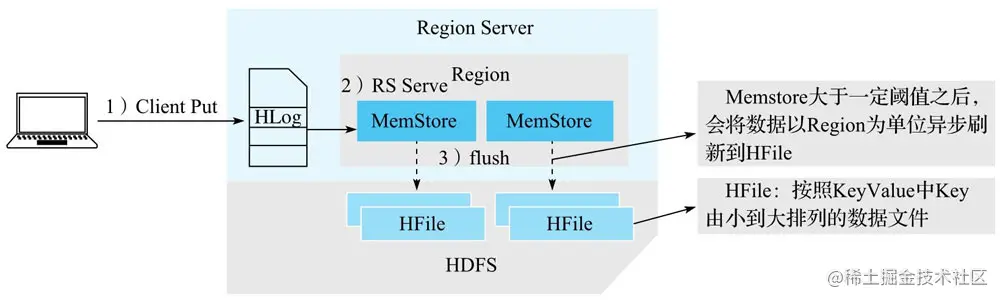 3)MemStore Flush阶段:当Region中MemStore容量超过一定阈值,系统会异步执行flush操作,将内存中的数据写入文件,形成HFile。