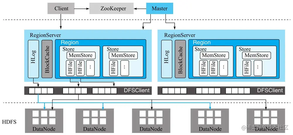 HBase底层依赖HDFS组件存储实际数据,包括用户数据文件、HLog日志文件等最终都会写入HDFS落盘。HDFS是Hadoop生态圈内最成熟的组件之一,数据默认三副本存储策略可以有效保证数据的高可靠性。HBase内部封装了一个名为DFSClient的HDFS客户端组件,负责对HDFS的实际数据进行读写访问。
