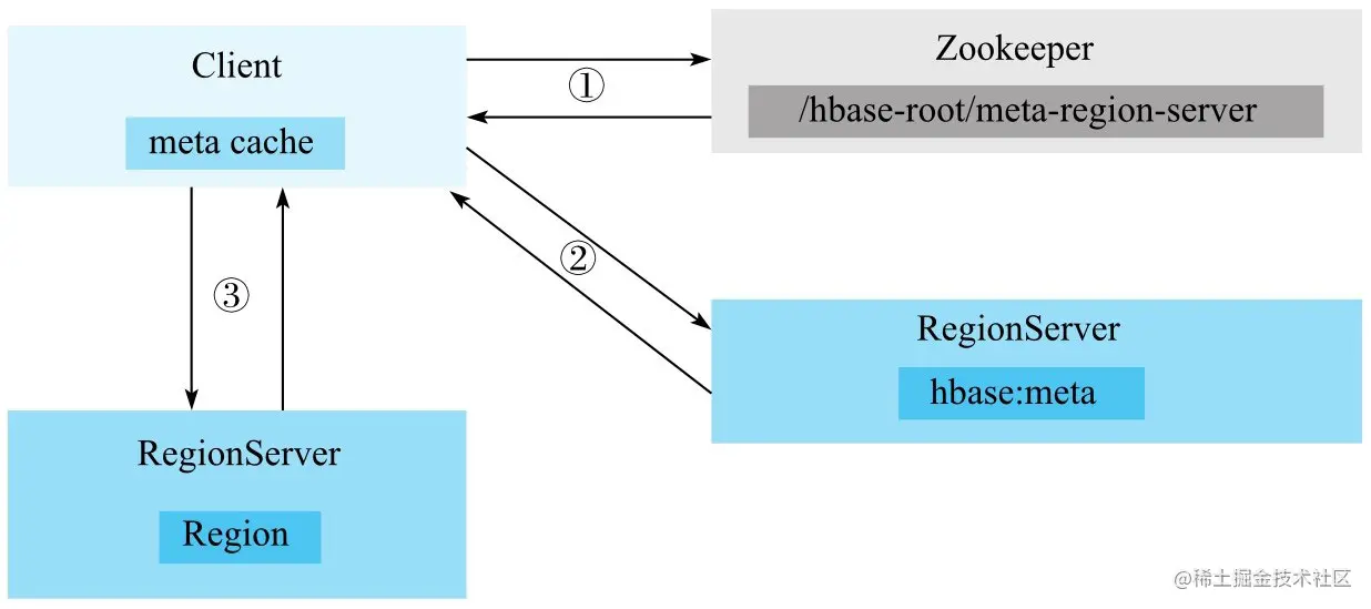 hbase:meta所在的RegionServer发送查询请求,在元数据表中查找rowkey所在的RegionServer以及Region信息。客户端接收到返回结果之后会将结果缓存到本地,以备下次使用。 -