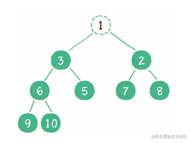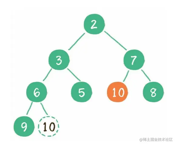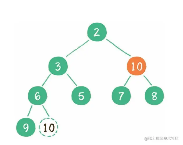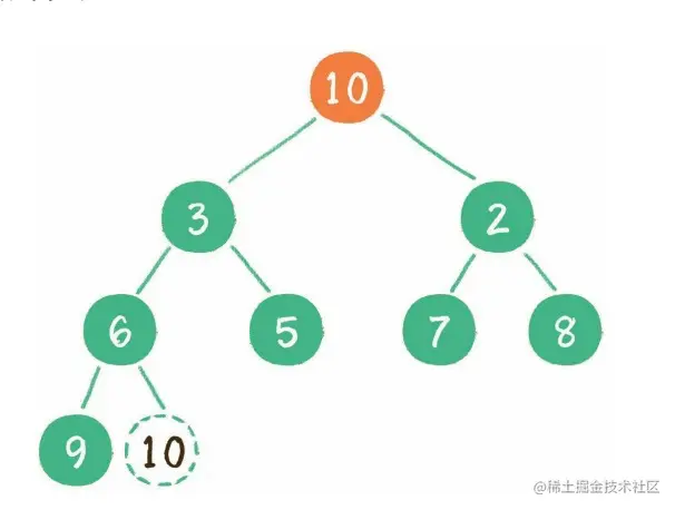 1. 这时为了维持完全二叉树的结构,我们把堆的最后一个节点 10 ,临时补到原本堆顶的位置