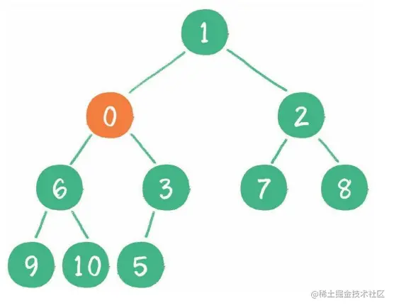 2. 这时,新插入节点的父节点 值为 5 ,比 0 大,显然不符合最小堆的性质,于是让新节点上浮,和父节点交换位置