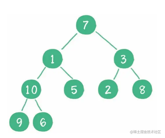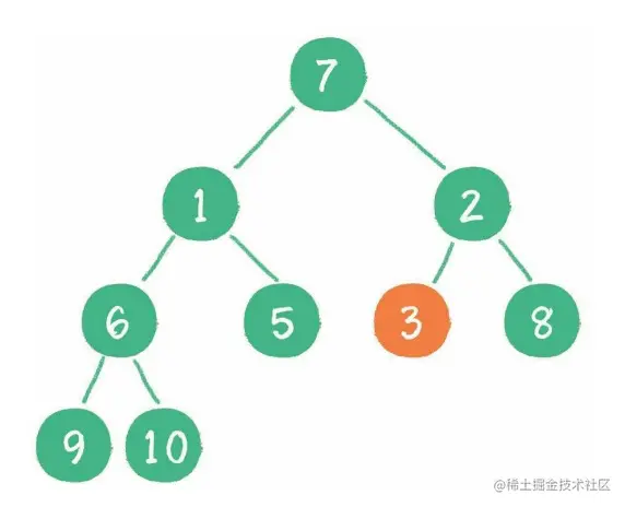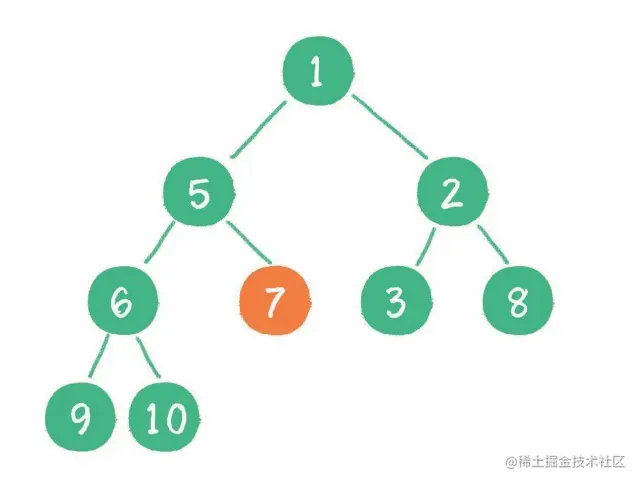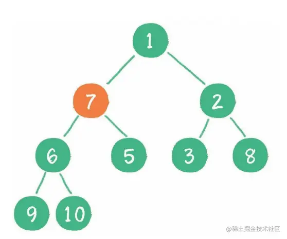 4. 接下来轮到节点 7,如果节点 7 大于它的 左、右孩子节点中最小的一个,则节点 7 "下沉"