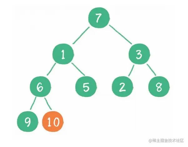 3. 继续让节点 10 和它的左、右孩子做比较,左、右孩子中最小的是节点 7,由于 10 大于 7,让节点 10 继续下沉