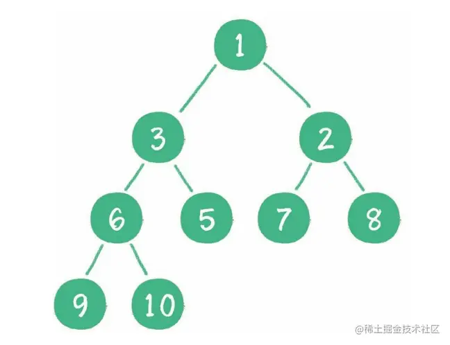 1. 首先从最后一个非叶子节点,也就是从节点 10 开始,如果节点 10 大于它左、右孩子中最小的那一个,则节点 10 下沉