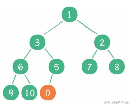 1. 当二叉树插入节点时,插入的位置是完全二叉树的最后一个位置,例如插入一个新的节点,值为 0