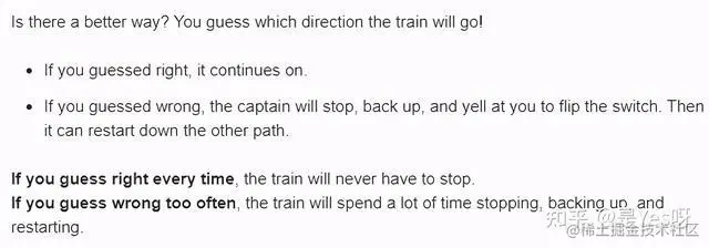 猜对了火车就不用停,继续开。猜错了就停车然后倒车然后换道再开。