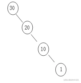 但二叉查找树也有一个问题,即它在极端情况下会退化成链表。例如我们有这样一组数字:30、20、10、1,它们组成二叉查找树之后就会退化成普通链表。