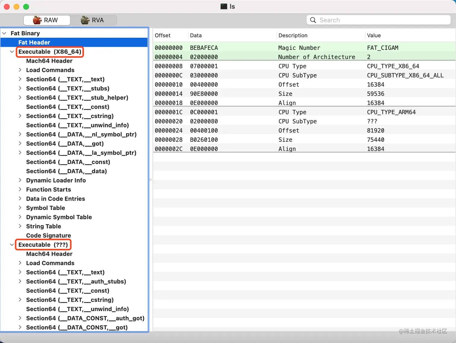 分析文件是系统的ls,它的路径在/bin/ls,把它放到MachOView里。ls是一个FAT文件,它包含两个架构,Fat Header里记录了各个架构的类别、偏移量、大小等信息。