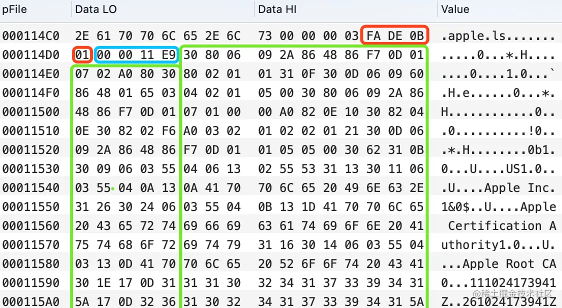 为0xFADE0CC0,对应CSMAGIC_EMBEDDED_SIGNATURE,代表嵌入的代码签名数据。