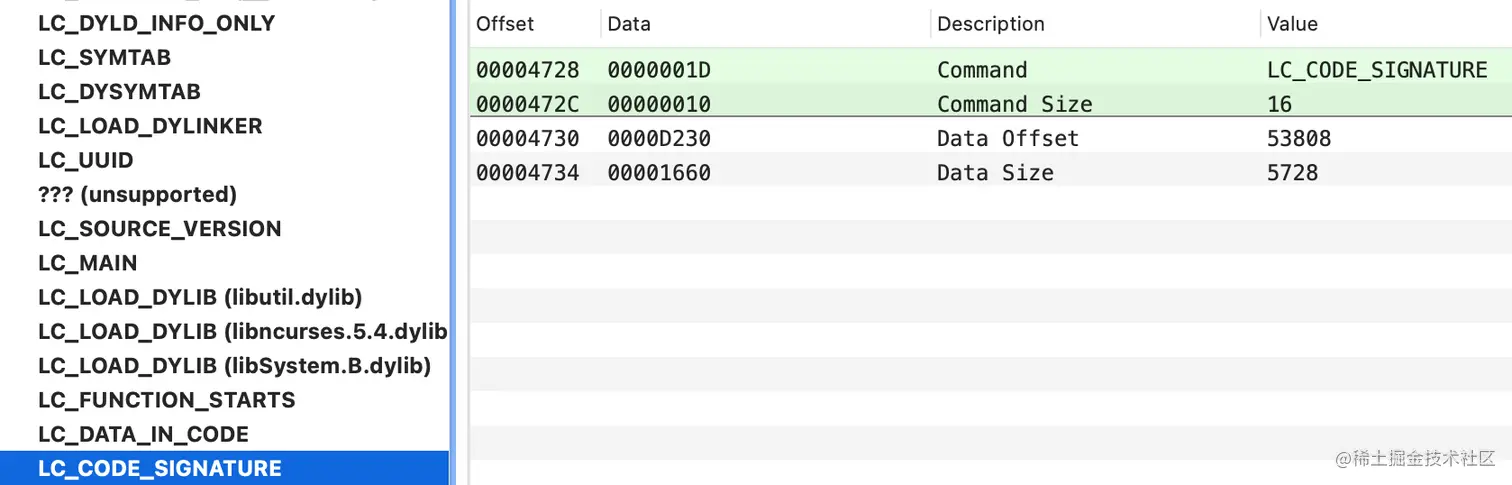 第一行里的offset 53808 对应16进制是0xD230,就是LC_CODE_SIGNATURE里记录的偏移量。