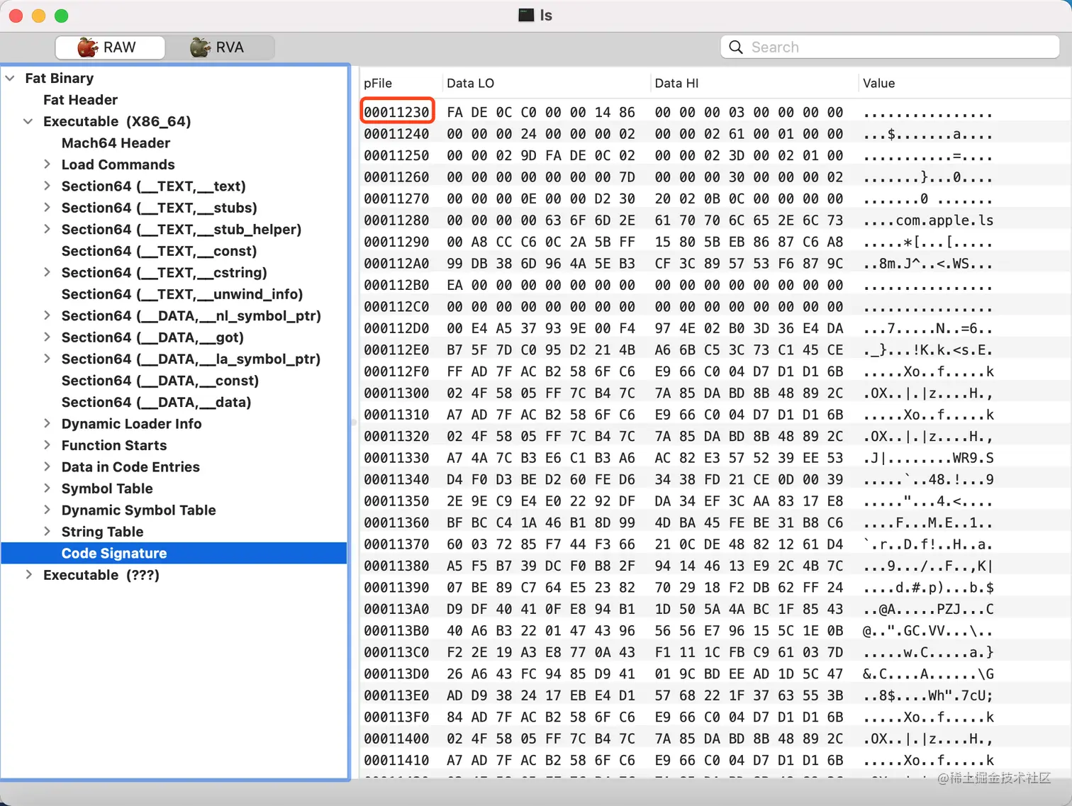 本节的重点是找到Code Signature(代码签名)这部分内容,它没被MachOView解析,还是原始的数据形态,是一个比较好的分析案例。