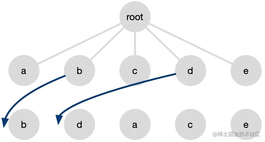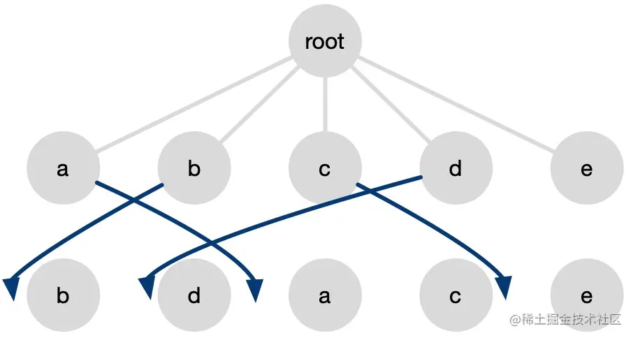如图所示,只按层比较,就可以将时间复杂度降低为 O(n)。按层比较也不是广度遍历,其实就是判断某个节点的子元素间 diff,跨父节点的兄弟节点也不必比较。