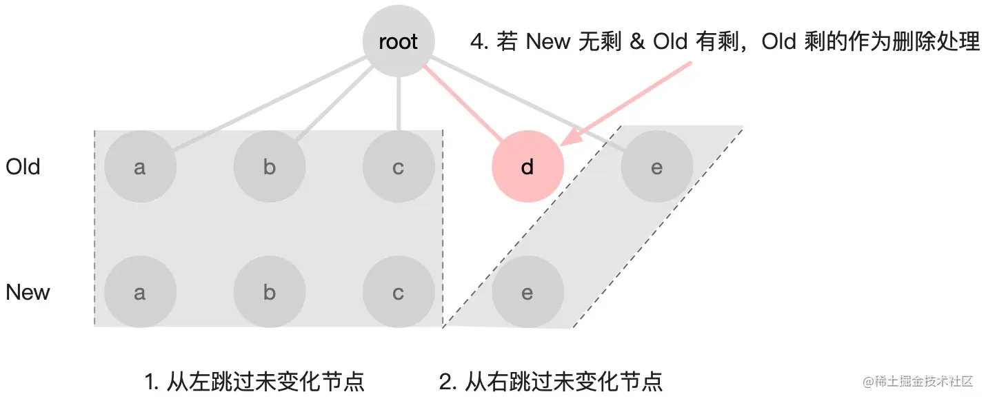 第一和第二步完成后,发现新树指针重合了,但旧树还未重合,说明什么?说明旧树剩下来的在新树都不存在了,批量删除即可。