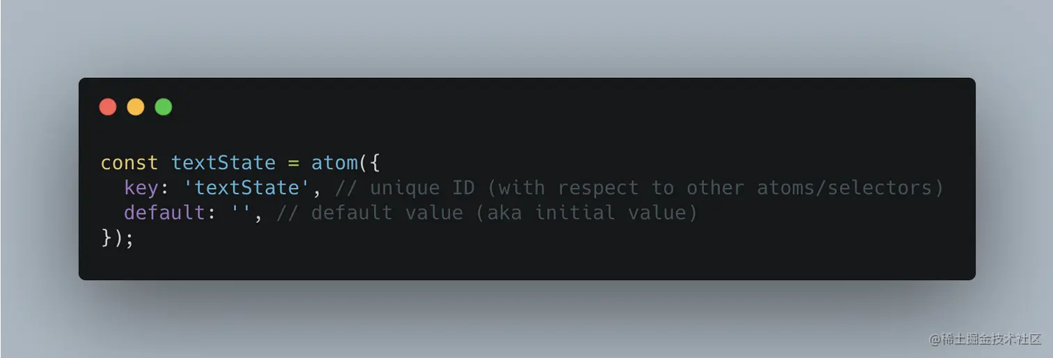 Recoil中,将每一个最小的状态单位(即无法从其他状态计算得出)定义为一个 Atom。对于每一个 Atom ,其实返回的是一个对象,包括了 key(这个 key 是从传入的 option 中解构出来的,并且需要全局唯一), 以及提供了 get 和 set 等方法。