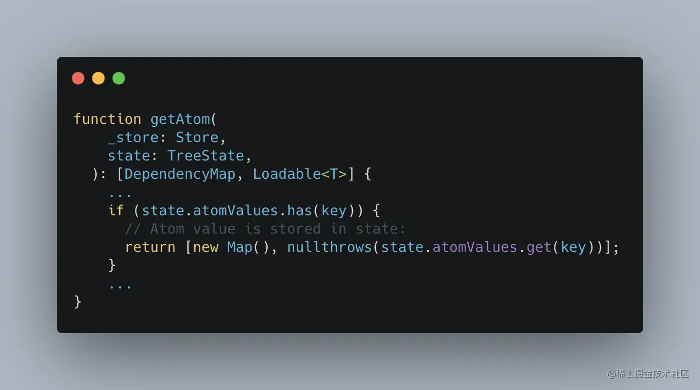 对于 Atom 而言,必须有一个 set 方法,因为我们定义一个原子数据,肯定需要对其进行修改,否则是没有意义的。而对于 Atom 而言,其 get 方法相对简单,在 key 存在的情况下,直接从一个状态的 Map 中获取即可。