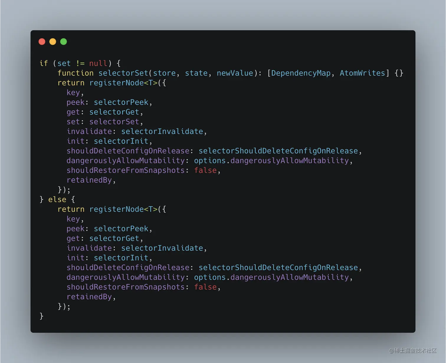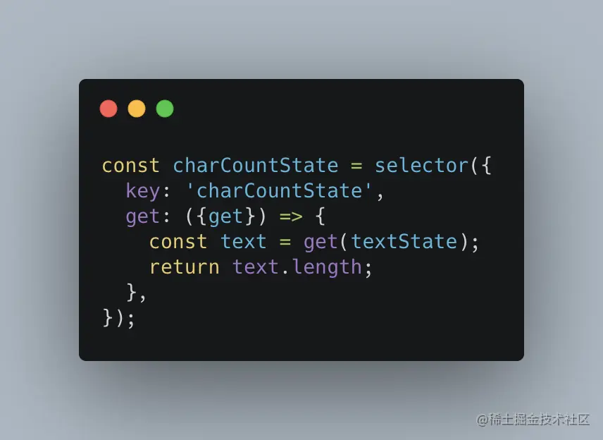 对于 selector,也与 Atom 一样,也提供了 get 及其他方法,然而,对于 selector 而言,是可以通过 Atom 得到的,所以 set 方法则不是必须的。