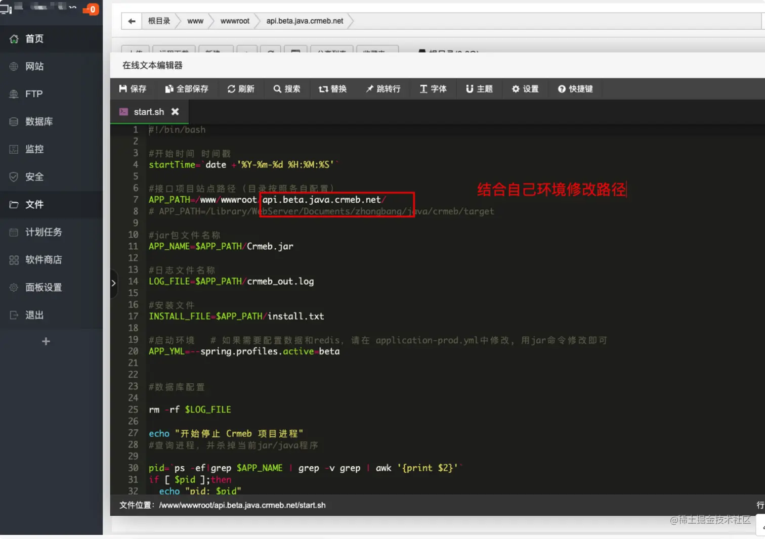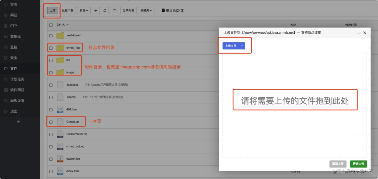 - 上传crmeb目录下的 start.sh文件api.app.com站点下。和 Jar包在同级目录