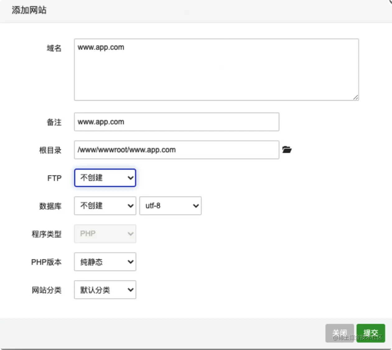 - 进入宝塔点击左侧网站,点击右侧添加站点,会弹出窗口,请按下图设置