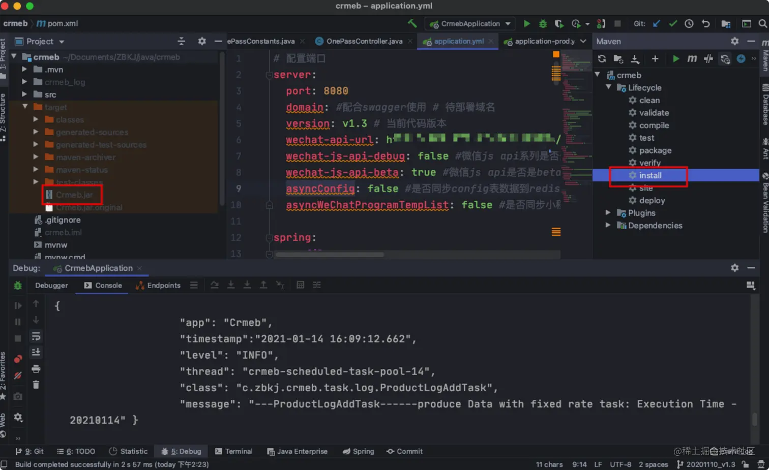 - 如下图所示执行打包后得到 Crmeb.jar