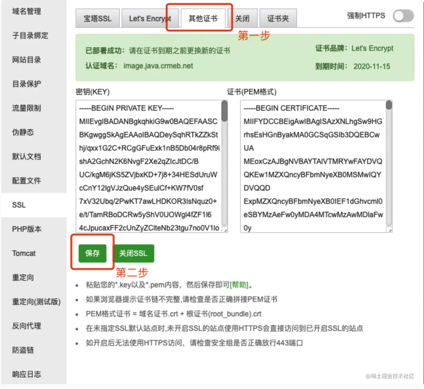 - 设置https证书,宝塔有免费证书可设置,在网站列表