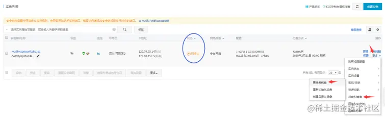 4.等待服务器状态为“已停止”,点击最右侧更多→磁盘和镜像→更换系统盘