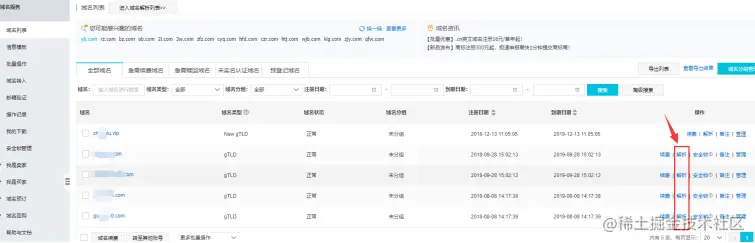 2.解析域名。选择你需要配置的域名,点击右侧解析