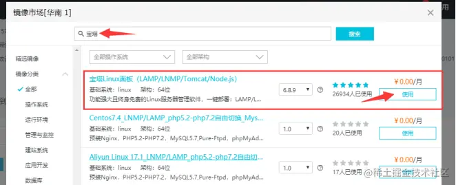 7.在弹出框输入“宝塔”,点击搜索,选择第一个“宝塔Linux面板(LAMP/LNMP/Tomcat/Node.js)”点击使用