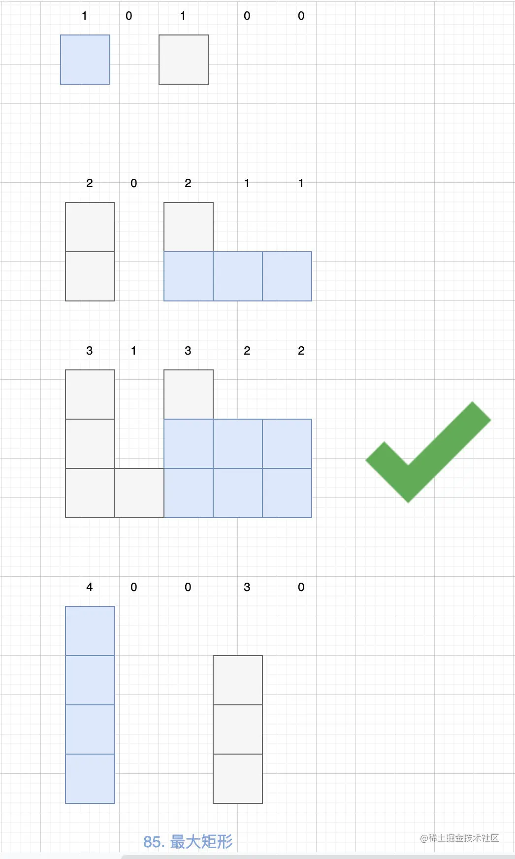 这样我们就可以使用84. 柱状图中最大的矩形 中的解法来进行了,这里我们使用单调栈来解。