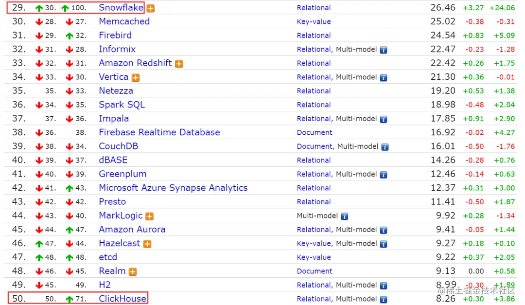 对于排名 20 之后的数据库,以年为维度,排名显著上升的数据库有 Snowflake 和 Clickhouse,Snowflake 由去年同时期的第 100 名上升到现在的第 29 名,后者也从第 71 名上升至第 50 名。