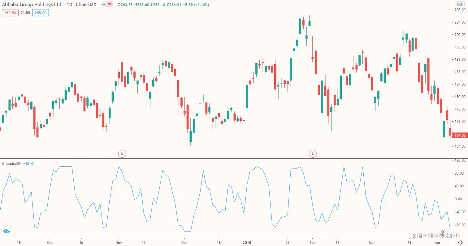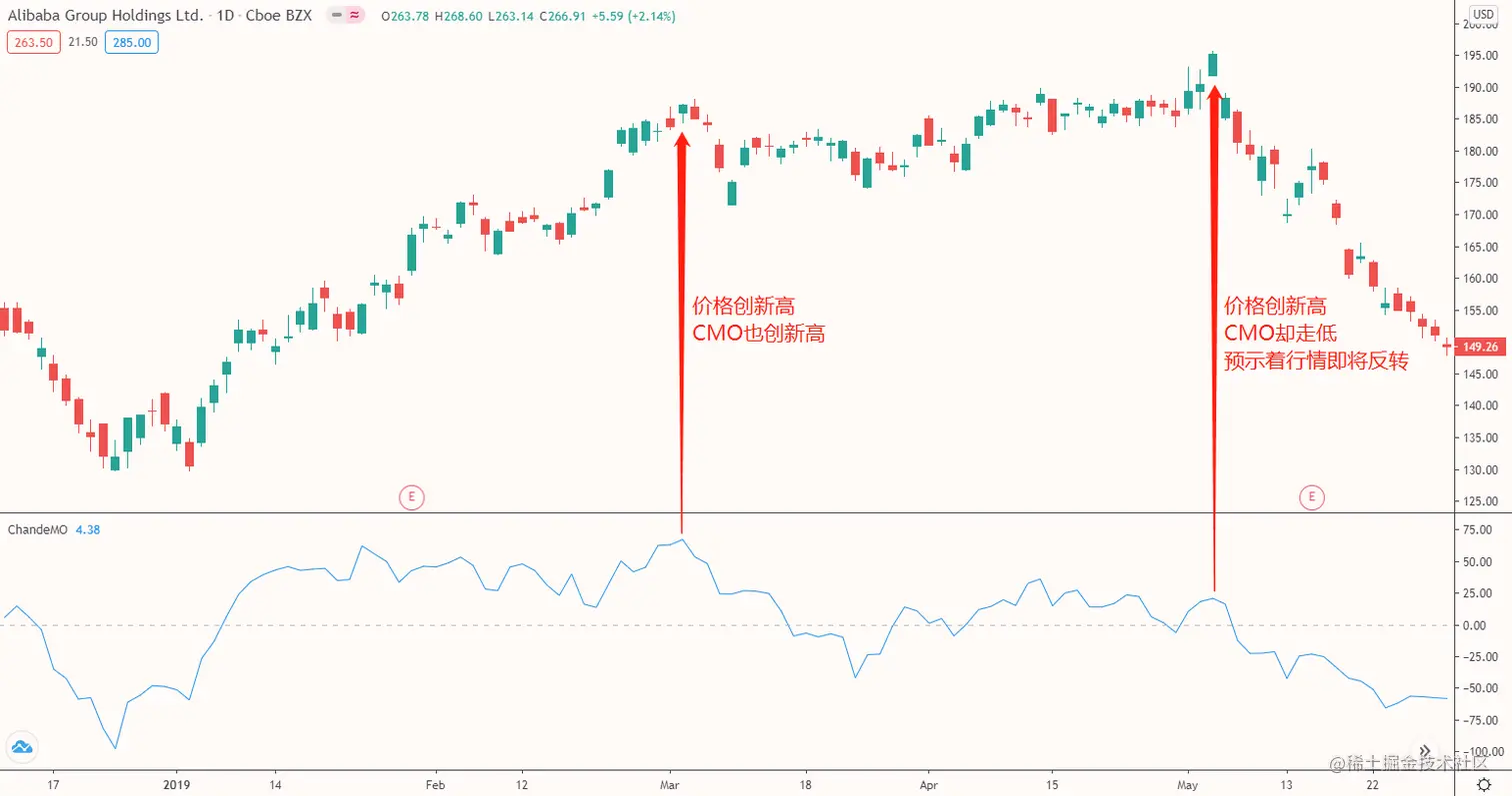 理论上CMO应该与价格通向,如果价格创新高,但CMO没有创新高,甚至走低,那么价格上涨趋势可能即将反转;如果价格创新低,但CMO没有创新低,甚至走高,那么价格下跌趋势可能即将反转。如下图所示: