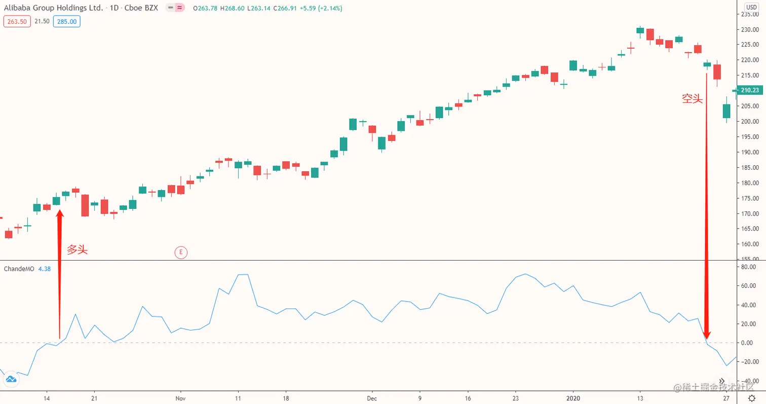 CMO的绝对值越高,表明趋势的力量越强,如下图所示: