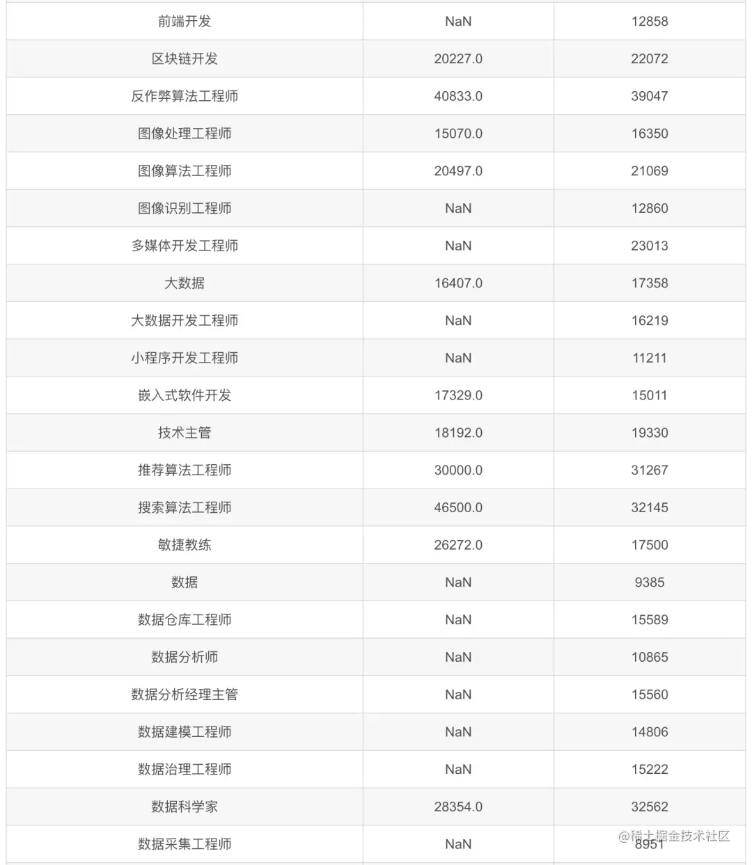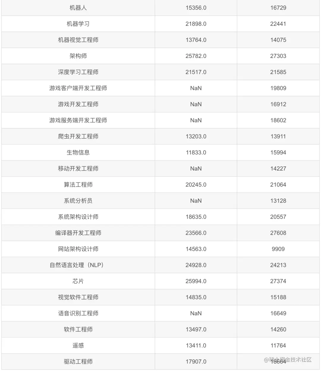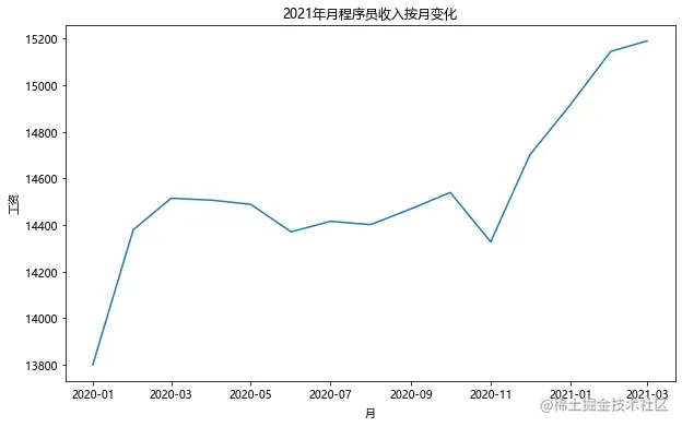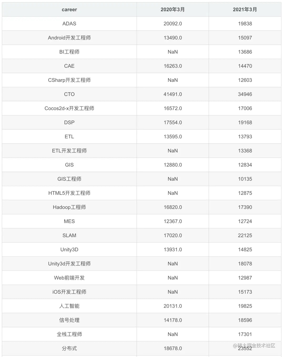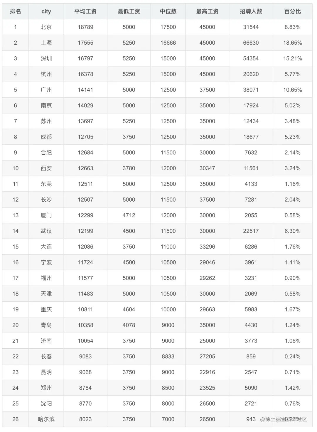 2021年3月程序员工资统计数据出炉,又拖后腿了…… 编程学习网 2021-04-06 705 阅读1分钟 2021 年 3 月采集数据 124176 条。 2021 年 3 月全国程序员平均工资 15189 元,工资中位数 12500元,其中 95% 的人的工资介于 5250 元到 37500 元。 工资K线图 这个月涨了一点点,一点点也是涨呀。 程序员的工资虽然不高,但是涨幅还是超过了大盘的。 分布 城市 杭州的工资又被深圳超过了,哎。 职能 怎么样,这份通过统计的数据是否反映真实状态呢?