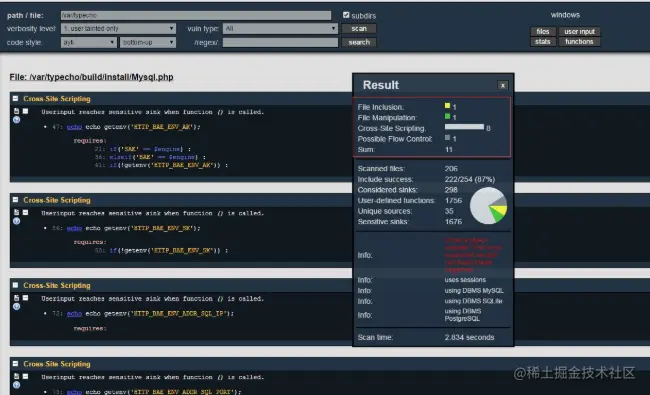 它能够将PHP源代码转换为程序模型,检测程序流期间用户输入可能污染的敏感接收器,即潜在易受攻击的函数。只有它可以检测到最深层嵌套在代码内部的最复杂的安全错误,准确性极高,是分析代码的最佳选择。