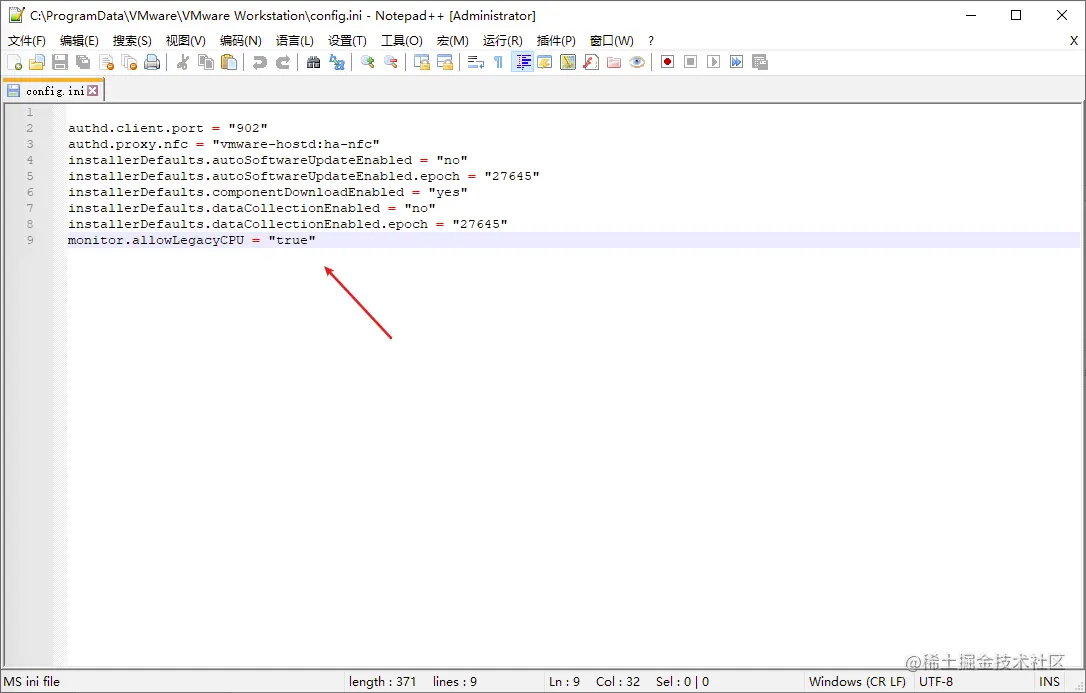 打开文件,在末行中添加:monitor.allowLegacyCPU = "true"。