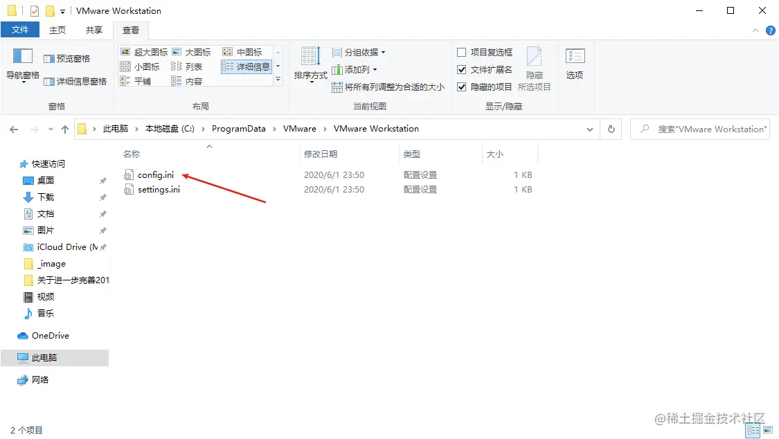 此时需要修改VMware的config.ini文件,默认所在目录为:C:\ProgramData\VMware\VMware Workstation\config.ini。(ProgramData目录默认隐藏,需要在查看中勾选:隐藏的项目)