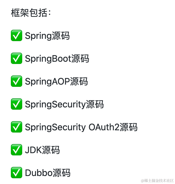 Java 流行框架的源码分析项目。目前包含 Spring 源码、SpringBoot 源码、SpringAOP 源码、SpringSecurity 源码、SpringSecurity OAuth2 源码、JDK 源码、Dubbo 源码等。讲解非常深入透彻,能够帮助大家更好地通过学习框架底层源码来提升自身的水平,在大厂面试时在众多面试者中脱颖而出!